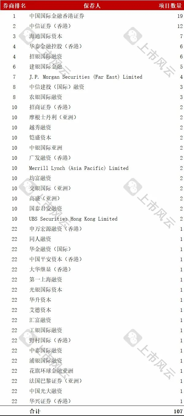 注:速腾聚创(02498.HK)、长久股份(06959.HK)等共32家公司有多家联合保荐人,为了简化统计分析处理,项目数量均按1计算,故项目总量为107。