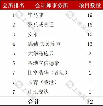注:富景中国控股(02497.HK)有多家申报会计师,为了简化统计分析处理,项目数量均按1计算,故项目总量为72。