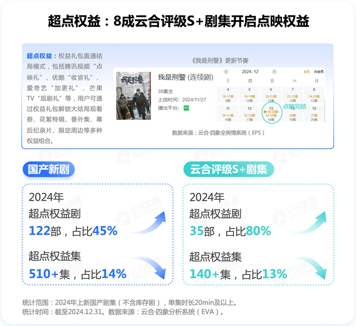 超点权益方面,2024年上新国产新剧中共122部剧集支持点映直通结局,占比45%;头部精品剧集点映礼常态化,在云合评级S+剧集中超点权益剧占比高达80%。