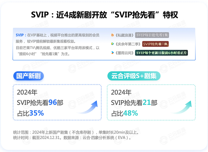 在SVIP上,2024年年初腾讯视频正式加入,在部分剧集中尝试“SVIP抢先看6小时”;芒果TV也于2024年4月推出SVIP会员服务,针对部分剧集开放“SVIP抢先看”特权。2024年上新国产新剧中,启用该模式的剧集共96部,占比35%;云合评级S+剧集中开展“SVIP抢先看”服务的剧集占比达48%。