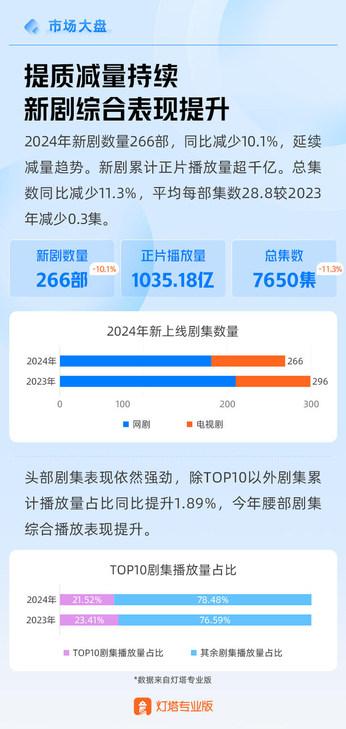 2024年,在剧集市场内部,继续呈现减量增质的趋势,据灯塔专业版近日发布的《2024年剧集市场报告》(以下简称《报告》),全年长剧(15分钟以上)数量266部,较2023年减少10.1%,总集数也同比减少11%,不过包括《繁花》《我的阿勒泰》等在内多部爆款剧仍发挥出了引领大盘的作用。同时,剧集的集数还呈现向短、精、简的趋势,并且如仅有8集的《我的阿勒泰》,在5月份时不仅在全网有着很高的热度,而且带动了“影视+文旅”的产业联动。