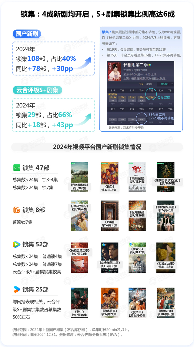 据云合数据统计,2024年上新的国产新剧中,采取锁集模式的剧集共108部,在上新剧中占比40%,较2023年大幅增长。头部热门剧集中该模式更为普及,2024年云合评级S+剧集中,采用锁集模式的剧集部数占比66%,较2023年增长43个百分点。