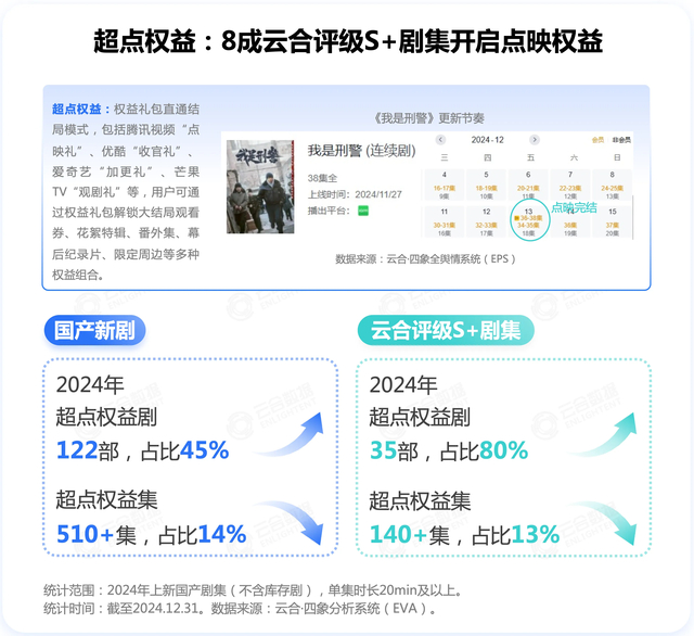 超点权益方面,2024年上新国产新剧中共122部剧集支持点映直通结局,占比45%;头部精品剧集点映礼常态化,在云合评级S+剧集中超点权益剧占比高达80%。