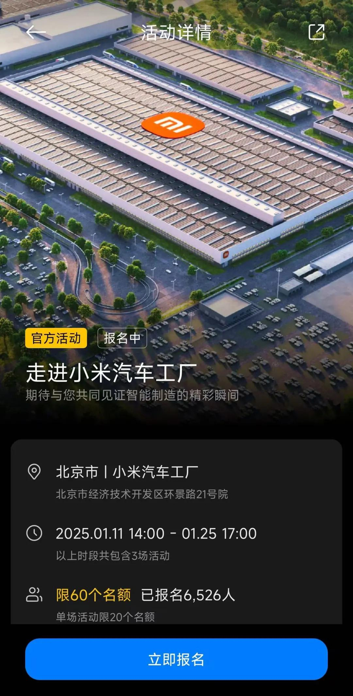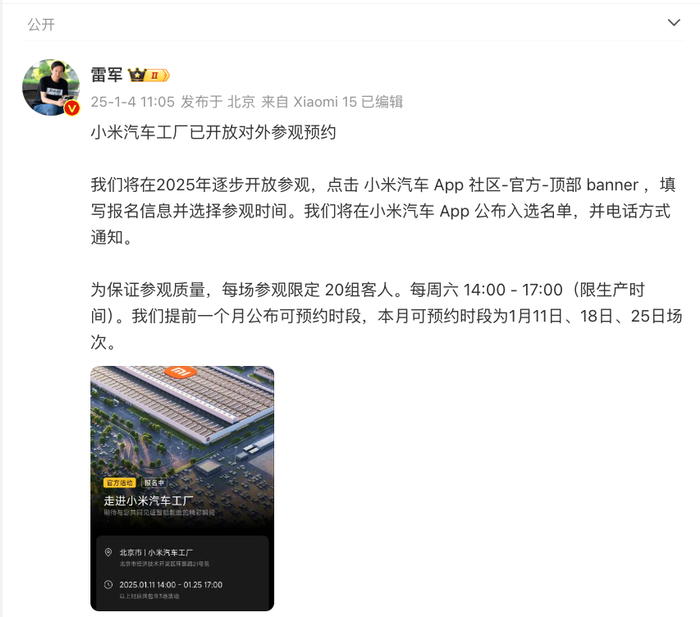 雷军表示:“我们将在2025年逐步开放参观。为保证参观质量,每场参观限定20组客人。每周六14:00 - 17:00(限生产时间)。我们提前一个月公布可预约时段,本月可预约时段为1月11日、18日、25日场次。”