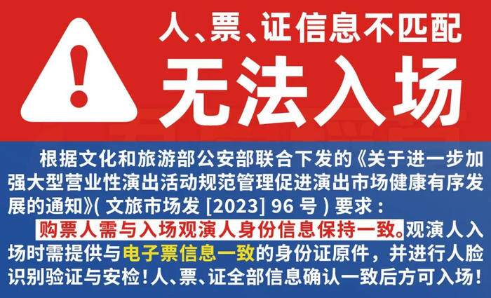 1、本场演出为实名制购票入场,同一证件仅能对应一张本场演出门票,消费者不得使用同一证件在不同购票渠道重复购买本场演出门票。