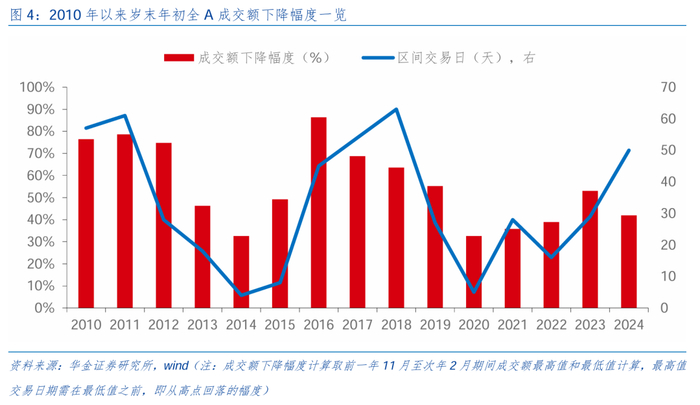 复盘历史,岁末年初A股可能季节性缩量,且若出现风险事件则可能使春季行情延迟启动或结束。(1)岁末年初A股成交额可能出现季节性回落。我们统计了2010年以来岁末年初(前一年11月至次年2月)期间全A单日成交额可能出现季节性回落(即从最低成交额交易日前的最高值回落的幅度),幅度多在30%至80%左右,回撤平均持续30个交易日左右。(2)岁末年初若出现风险扰动事件则可能导致春季行情延迟启动或结束。历史经验来看,若年初出现外部风险事件,则可能推迟春季行情启动或使行情过早结束,例如:2020年初疫情的爆发导致当年春季行情从2月开始,后国内抗疫特别国债增发、美联储降息等推动行情向上;2022年2月俄乌冲突爆发,春季行情在3月初结束,直至4月底国内疫情得到明显控制后大盘才企稳。