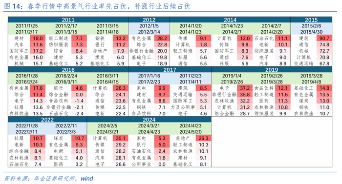 春季行情中高景气行业率先启动,后期补涨行业相对占优。我们将春季行情开启较后年份中按照指数节奏划分时间,分别将不同时期涨幅前5的行业列出发现:(1)春季行情前期高景气率先启动,如2011受益于商品房销售增速达约27.4%左右的建筑装饰、机械设备;2014年受益于互联网周期叠加3G推动传媒、计算机率先走强;2016、2017受益于供给侧改革下产能出清盈利优化的有色金属、建筑建材等行业率先走强、2019年受益于半导体上行周期下的电子、计算机走强, 2022年受益于新能源趋势下的电新走强, 2024年受益于AI周期开启下的计算机、传媒、通信走强。(2)春季行情后期,补涨行业相对占优,如2011年受益城镇化下原料价格上升的轻工、钢铁、家用电器,2014年受益于减产协议下供给收缩的石油石化,2016年受益物联网、云计算等带动第三轮半导体上行周期下走强的计算机、通信、传媒,2019.12受益于外资流入及保增长政策下走强的食品饮料、纺织服装以及新能源趋势下工业金属需求回升、库存下降的基础化工、有色金属,2022受益于地缘冲突下供给收缩减产及经济修复预期下的煤炭、有色金属、基础化工,2024年受益于财政政策及内需提振政策发力下走强的家电、供给收缩下走强的有色金属、及地产政策放松下的地产。