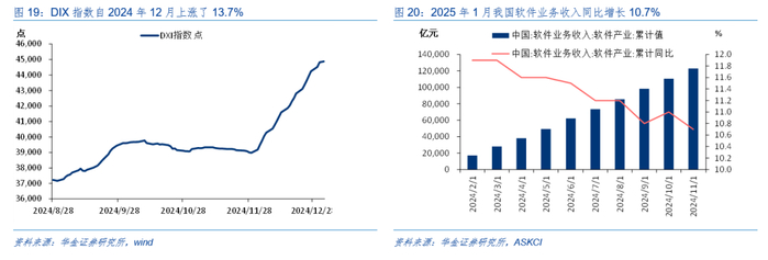短期调整后市场情绪可能企稳。(1)特朗普上台后可能加征关税、美联储1月暂停降息等海外因素对市场情绪可能有扰动。一是特朗普再度上任对于我国商品关税加码的预期持续扰动市场情绪:据Guardian预测,特朗普的计划可能将关税提高到20世纪30年代以来的最高水平,全球贸易紧张局势可能即将出现,但我国出口结构持续改善,出口对象逐步转移至欧盟、东盟、巴西、非洲等地,且内需在政策支撑下逐步修复,对我国制造业的冲击可能远小于2018年。二是美联储1月暂停降息等海外因素对市场情绪可能有扰动:受美国经济数据和美联储偏鹰表态影响,1月暂停降息概率较大,降息节奏逐步放缓下对风险偏好可能有一定压制。(2)降准、两会政策预期等依然对风险偏好有支撑。一是前期对货币政策定调积极,提出适时降准降息,在年初资金面呈季节性紧张趋势的环境下央行节前可能有降准操作,届时市场情绪有望迎来修复。二是两会可能进一步积极扩张财政、完善产业政策:首先在前期明确财政政策加码后,市场对于两会进一步细化财政扩张规模和发力方向的预期大幅上升,预期两会将进一步明确财政扩张的规模和方向,可能包括提高赤字率、加速发行超长期国债、增加中央对地方的转移支付等措施,以支持经济复苏并提振市场信心;其次产业政策上可能加速制造业升级,预计将加大对关键核心技术的投入,特别是在半导体、人工智能、生物医药等领域,政策加速落实以推动制造业数字化和智能化转型,支持高端制造业发展。