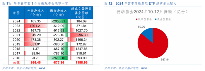 市场情绪回落导致融资有所流出,但年初融资、外资等资金可能季节性回流。(1)1月微观资金有望随着春季行情开启修复。一是新发基金来看,本周新成立偏股型基金份额共99.34亿份(前值为150.7亿份),受元旦假期影响新发基金份额小幅下降,但从2024Q4被动型基金的发行规模来看,超八成均为股票型ETF,中长期资金加大流入力度下新发基金份额可能继续回升。二是受近期市场情绪有所回落、节前避险情绪上升等因素影响,本周截至1月2日融资净流出193亿元(前值为-86.3亿),后续可能随着春季行情开启逐步修复。(2)季节效应来看,外资和新发基金大概率继续流入。一是统计2016年以来历年春节前1个月微观资金的净流入情况来看,融资在节前多流出,外资在春节前多保持净流入;外资、融资、新发基金春节前1个月净流入均值分别为366.5亿元、-877.4亿元、1189亿份。二是险资在年初也多流入A股,2015至2024年期间的9年,保险资金(运用在股票和证券投资)在1月和2月分别净流入5次、6次。三是随着财政和货币政策的逐步落实,以及经济修复预期的提升,外资、新发基金、险资等增量资金有望在春节前继续回流,预计微观流动性将保持宽松的趋势。