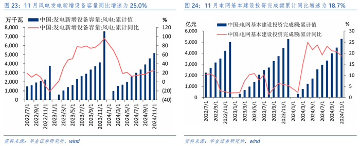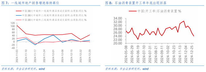 经济和盈利延续弱修复。(1)高频数据显示基本面仍在弱修复。一是一线城市地产销售增速维持高位:首先,最新销售数据来看,一线、二线、三线城市商品房成交面积当周同比分别为44.4%、9.4%、1.1%,近期一线城市商品房销售同比增速维持高位,地产政策放松下一线城市实施效果较为明显;其次,原材料价格来看,水泥价格指数维持高位,平板玻璃产量增速降幅也有所收窄(-6%→-5.6%),或指向地产项目开工持续推进;最后,当前地产销售增速已出现边际改善,预计在后续政策持续发力下投资、开工增速均有望企稳。二是寒冷天气和节假日因素影响基建项目开工可能放缓:受季节因素影响,年底石油沥青装置开工率在元旦假期、寒冷天气的扰动下出现明显回落,但螺纹钢开工率维持在40%以上的相对高位,后续随着春节假期的来临,基建项目开工速度可能放缓,但中长期来看有望在财政政策的进一步发力下带动实物工作量形成而转好。(2)工业企业利润增速显示盈利回升趋势不变。工业企业利润增速来看,10月工业企业利润增速为-10.0%,而11月工业企业利润增速为-7.3%,增速降幅收敛了2.7%; 10-11月的利润增速为-8.7%,高于7-9月工业企业利润增速的-13.6%,增速提升了5.0%,因此四季度A股盈利增速大概率继续回升。