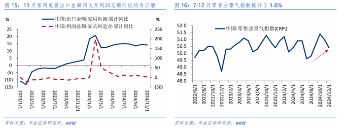 逢低配置可能受益于政策的食品、汽车、商贸零售、社服。一是食品饮料行业, 11月酒、饮料和精制茶制造业利润总额累计同比大幅上升至9.3%,上升了14.7pcts,随各地出台消费券促餐饮等措施,基本面修复确定性较高。二是汽车行业,乘联会初步统计12月全国乘用车厂商零售销量270万辆,同比增长15%,环比增长11%;11月我国汽车产销同比增速分别为4.2%、3.7%,均处于7月以来的高点,当前车企年底促销、政策以旧换新推进下汽车景气有望高增。三是商贸零售,商品零售中粮油食品、饮料类、日用品类销售额同比分别为10.1%、-4.3%、1.3%,必选消费表现较为稳健;各地消费政策不断加码下,7-12月零售业景气指数上升了1.6%,后续在中央工作经济会议提出全面扩大内需下预计继续提振行业景气。四是社服行业,11月社会消费品零售总额同比3.0%,回落1.8个百分点,主要原因在于促销和新品发布时点错位,突出表现在非房地产相关耐用品及非耐用可选品类别中如通讯器材、纺织服装和化妆品,消费补贴的耐用品需求刺激作用维持强劲。