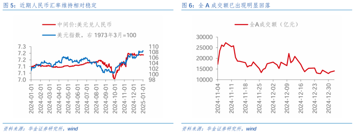 今年春季行情还在,调整后是逢低配置机会。(1)今年政策和流动性仍可能偏宽松,外部风险有限,春季行情大概率还在。一是年初积极的政策依然可能进一步出台和实施:首先,经济政策上,以旧换新和设备更新政策仍在大力推动落地,超10省市宣布2025年延续以旧换新补贴政策,家电、消费电子等产品需求有望进一步拉动,后续两会即将召开,设备更新和以旧换新政策规模和适用品种可能扩大,赤字率提升、超长国债发行规模提升等政策预期也可能上升;其次,资本市场政策上,在“新国九条”的基调下,新一期互换便利、再贷款回购等政策继续实施,同时新增备选机构再次扩容,后续加大中长期资金入市、提高上市公司质量和分红等政策也有望逐步落地,政策端整体仍较为积极。二是年初外部风险扰动相对有限:首先,即便特朗普上台后再次对华加征关税,但在我国出口结构持续改善、科技创新不断突破下对我国影响可能有限;其次,国际码头工人协会(ILA)因寻求新的“反自动化”保护措施威胁要在1月15日罢工,成为特朗普就职后可能面对的首个政治难题,美国自顾不暇下特朗普可能难以轻易大规模加征关税。三是年初流动性可能维持宽松:首先,美元持续回升,但在经济修复和政策发力等预期下人民币汇率可能维持相对稳定,海外对国内流动性宽松的掣肘有限;其次,一季度是传统的信贷旺季,同时保增长政策导向下降准降息等可能逐步落地,国内流动性维持宽松。(2)当前A股成交额回调幅度已接近历史平均水平。一是从2024/11开始,全A单日成交额最高为2.7万亿,最低为不足1.3万亿,下降幅度约为53%,已接近历史均值56%,成交额缩量幅度来看可能调整已到位。二是短期大的风险事件出现的可能性较低,缩量可能是季节性的,难以造成春季行情延迟启动或结束,今年春季行情大概率仍在。