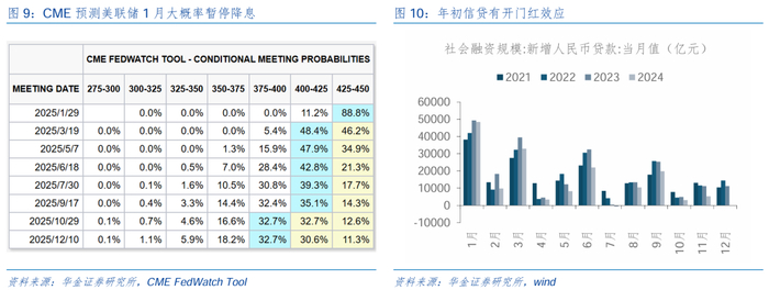 流动性维持宽松。(1)海外方面,美联储1月可能暂停降息,美元持续回升,但人民币汇率维持相对稳定。一是受美联储偏鹰表态及美国经济数据影响,市场对于1月美联储暂停降息的预期明显上升,CME预测1月暂停降息的概率接近90%,但海外流动性仍处于宽松周期内。二是近期美元指数震荡上行,但对人民币汇率的压制明显减轻,在国内稳增长政策持续落地改善经济修复预期的背景下,后续人民币汇率可能趋稳,海外风险对国内宽松的掣肘减轻。(2)1月信贷可能季节性回升,且春节前央行大概率实施降准。一是年底央行通过公开市场操作大幅回收流动性,12月27日回收货币超万亿,短期内资金面可能偏紧。二是年初信贷多有开门红效应,且政府债发行可能提前、1月交税高峰等因素影响下流动性需求较大,因此节前央行可能实施降准呵护流动性维持平稳。