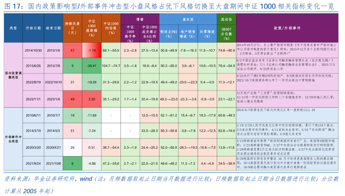 小盘风格出现短期调整主要受政策、小盘估值和情绪过高等因素的影响。我们根据诱发风格调整的原因的不同对于小盘调整期进行分类,将2014.10、2015.6、2022.8、2022.11归类为受国内政策影响的小盘调整期,将2010.6、2014.3、2020.3、2021.9归类为受外部冲击影响的小盘调整期,观察宏观指标总结规律发现:(1)小盘调整主要受政策调整和外部冲击,但政策调整或事件冲击过后小盘可能重新占优:一是受政策影响类型小盘走弱,如2014.10受严格退市制度《关于改革完善并严格实施上市公司退市制度的若干意见》、2015.6受《证券公司融资融券管理办法(征求意见稿)》清理杠杆资金、2022.8央行下调5年期LPR、2022.11央行稳地产“三支箭落地”下均推升大盘风格占优;而政策调整后,小盘风格即重新走强,如2014.12首个互联网银行成立及“互联网+”概念兴起、2015.7证金公司救市、2022.11进一步优化防控工作的二十条措施发布下使得小盘风格回归。二是受外部事件冲击下小盘走弱,如2010.6欧债危机下欧元对美元汇率一度跌破1比1.19、2014.3人民币兑美元汇率中间价连续回调,累计下跌154个基点、2020.3特朗普宣布暂停“欧洲到美国所有旅行”后,美国等9国股市熔断、2021.9美国财长耶伦发声警告 10 月中旬将是美国债务上限的最后期限下避险情绪引导市场转向大盘风格;而事件冲击过后,小盘风格即重新走强,如2014.4-2014.5央行降准叠加国九条版本后手游及互联网并购重组浪潮兴起、2020.3美联储宣布QE同时中央政治会议提高财政发行特别国债、2021.9美国贸易代表计划与中方就中美第一阶段经贸协议落实展开对话缓和摩擦情绪下小盘风格回归。(2)前期估值较高、情绪过热对小盘风格中短期调整影响也较大:8年中短期小盘调整中有5年中证1000的PE初始估值在高位、5年换手率处于高位、6年成交额占比全A在20%左右高位。(3)基本面对中短期小盘调整具一定影响:8年小盘中短期调整中有7年制造业PMI、地产销售增速、社零增速均不同程度恶化,仅有2014.5、2020.4、2023.1 “小切大”时期基本面三项指标中两项改善,基本面修复乏力下大盘风格缺乏持续走强动力。