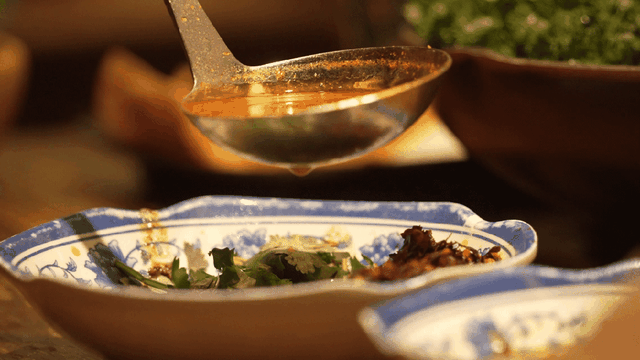 快来学学贵州人亲传的专业吃法!黄牛肉涮烫后夹着薄荷叶,裹上贵州地道蘸水,微辣肉香中带着薄荷清香,越嚼越上头,这一口下去,直接香迷糊了。