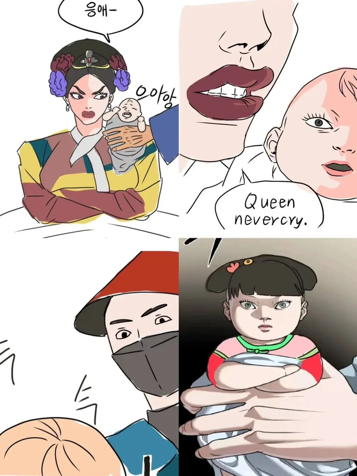 该梗出自一部搞笑韩漫,漫画中医生把哇哇啼哭的新生婴儿抱给妈妈时,女人似乎有些不耐烦,便凑到婴儿耳边低语道:Queen never cry。