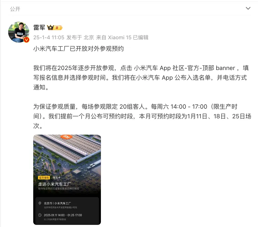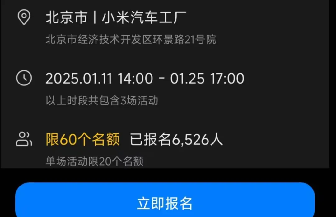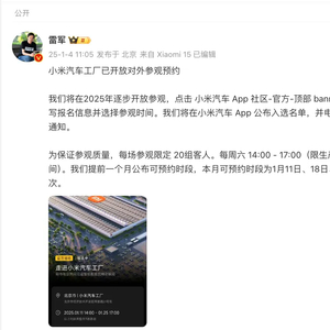 1月4日,雷军发微博宣布,小米汽车工厂已开放对外参观预约。活动有60个名额,截至1月4日13:30,已有超6500人报名。名额瞬间抢完,有网友直呼“根本排不上”。