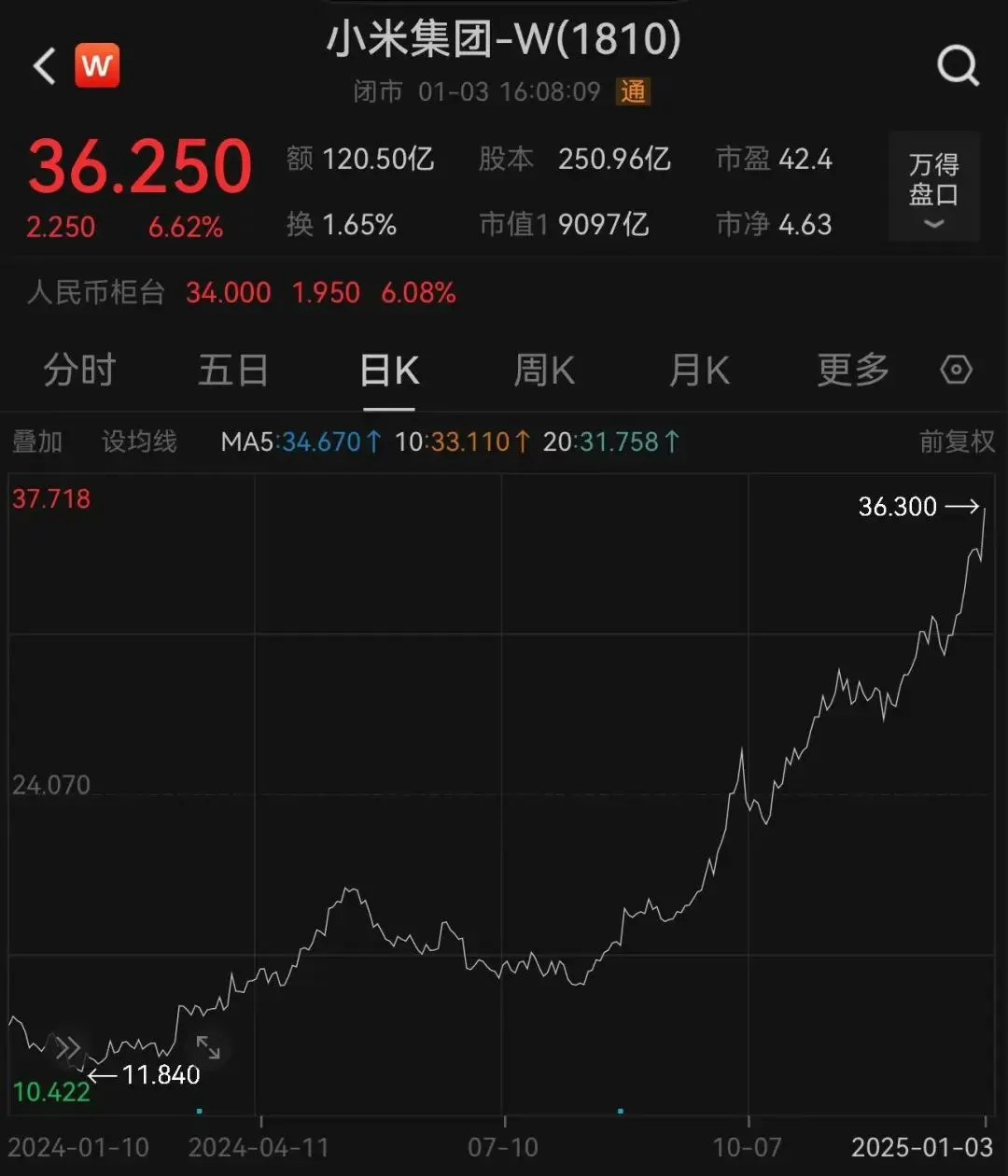 二级市场上,1月3日,港股小米股价一度涨近7%,最高报36.3港元/股,创小米港股上市以来股价历史新高,截至当日收盘小米集团报36.25港元/股,大涨6.62%,最新市值已经达到9097亿港元(8565.17亿元)。距离万亿港元大关一步之遥。