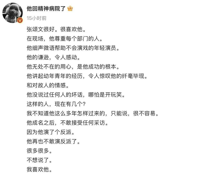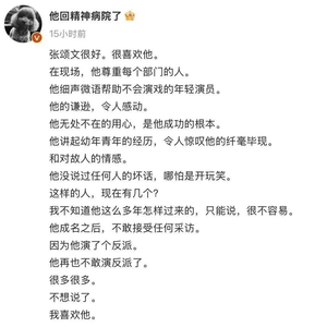 高群书在微博中回忆张颂文“细声微语帮助不会演戏的年轻演员”“没说过任何人的坏话,哪怕是开玩笑”“是一个好人,好演员,谨小慎微,战战兢兢,勤恳努力,即使成名之后”。