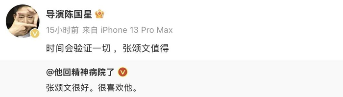 《横空出世》《冰雪11天》导演陈国星回复并转发高群书称赞张颂文的微博,称:“时间会验证一切,张颂文值得。”
