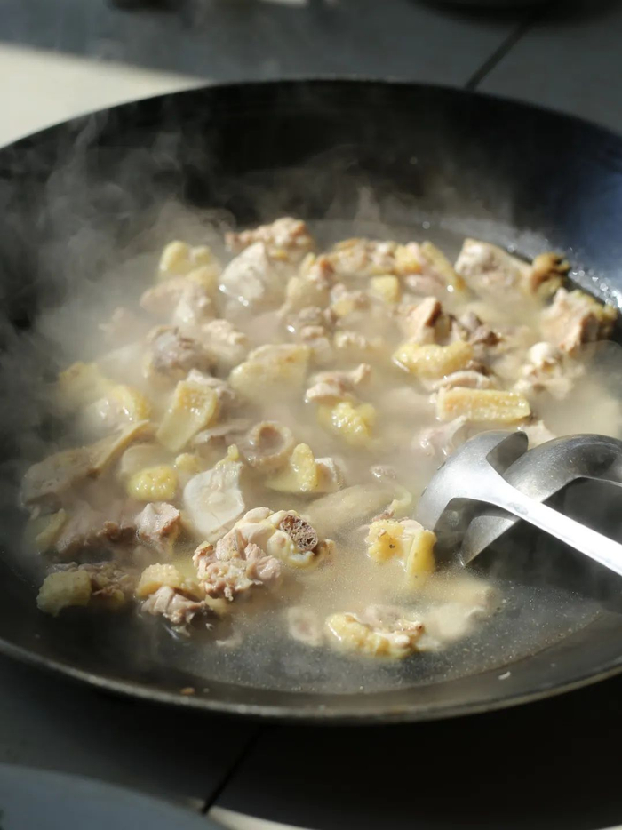 这间小馆子装修简单到什么程度?看那用油桶灌黄泥水做成的“石桌”就知道了。它既是“桌”,也是一个大灶台。客人下单后,老板娘往灶里放入炭火,架上大铁锅,倒入山泉水和鸡就完事了。待水滚后再煮个三五分钟,客人便能大快朵颐。别看烹饪方法如此粗暴,但不得不说,在自家果园里放养的走地鸡品质确实佳。鸡皮爽脆,鸡肉紧致,鸡味特别足。待鸡吃得差不多时,将用泉水做的腐竹放入“鸡汤”里浸个几分钟,鲜灵灵的豆香味和鸡汤的鲜味交织在一起,不好吃才怪呢。
