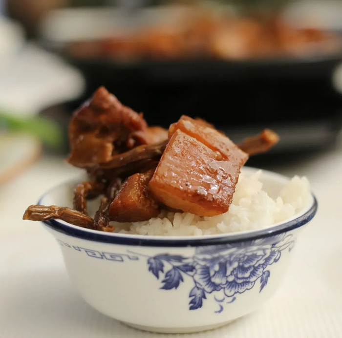 如果说,为吕田大肉“上妆”的调料是糖,那么为它“添香”的则少不了米酒。“吕田头酒的香味和大肉是最般配的,没有的话,也可以用高度数的米酒代替。等肉炒上色后,沿着锅边倒入米酒,起码要焖一个小时。”唐先生介绍道。