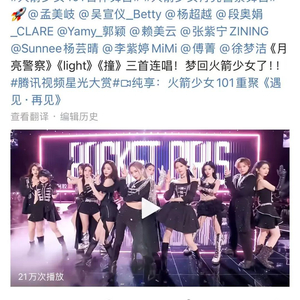 在星光大赏的舞台上,火箭少女101带来了《Light》《月亮警察》《撞》等经典曲目的完整表演。尤其是《撞》这首歌曲,是十一人版本的首次演绎,引起了现场观众的强烈共鸣 。