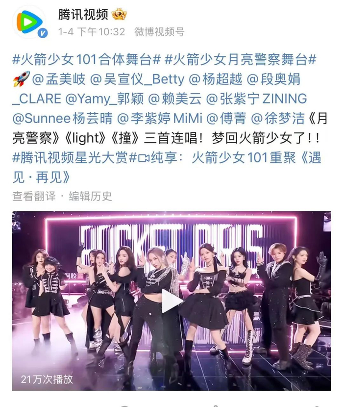 2025年1月4日,火箭少女101成员在腾讯星光大赏活动中实现了久违的合体,这是她们自解散以来首次全员集结 。