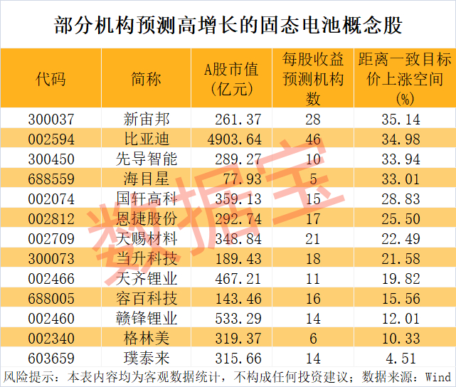 \r\n以最新收盘价与一致预测目标价相比,8股上涨空间逾20%,分别为 新宙邦 、比亚迪、先导智能、 海目星 、 国轩高科 、恩捷股份、 天赐材料 、当升科技。