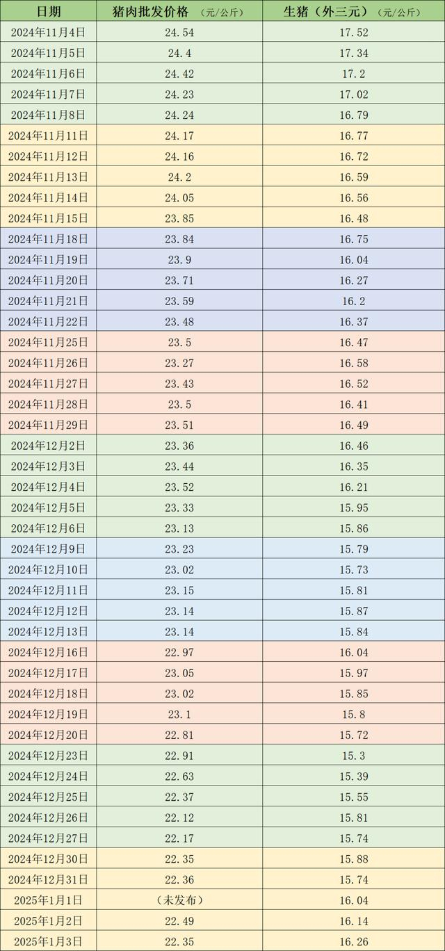 据农业农村部监测,1月3日,全国农产品批发市场猪肉平均价格为22.35元/公斤,与上周五(12月27日)的22.17元/公斤相比,上涨0.8%。本周的平均价格为22.39元/公斤,与上周22.44元/公斤的均价相比,下降0.2%。