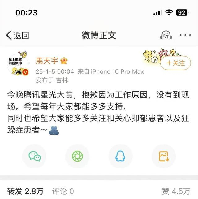 1月5日零点后,马天宇发布微博称,“今晚腾讯星光大赏,抱歉因为工作原因,没有到现场。希望每年大家都能多多支持,同时也希望大家能多多关注和关心抑郁症患者以及狂躁症患者。”