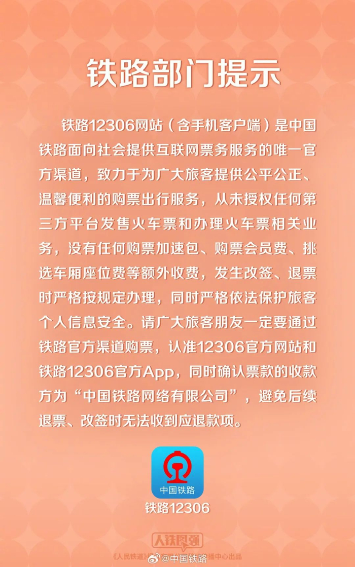 请广大旅客朋友一定要通过铁路官方渠道购票,认准12306官方网站和铁路12306官方App,同时确认票款的收款方为“中国铁路网络有限公司”,避免后续退票、改签时无法收到应退款项。