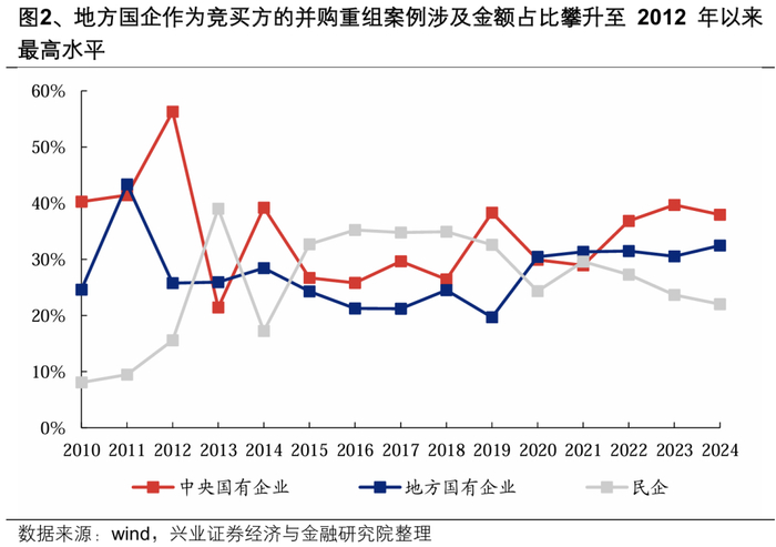 与13-15年并购重组周期不同,本轮并购重组市场上一个鲜明的特征是,地方国资的参与活跃度持续提升,正在成为本轮并购重组市场上的重要主导方。一方面,2024年以来已有至少29家上市公司实控人从个人或无实控人变更为地方国资,显示其正在资本市场上加速收购上市公司。另一方面,地方国企主导的并购重组案例涉及金额占比大幅攀升至32.4%,为2012年以来最高水平。