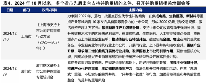 2024年以来,多地政府先后出台政策支持并购重组,研究推动上市公司并购重组专项措施。拥有优质资产、优势产业的地方政府,通过并购重组整合行业优质资源,打造龙头企业,或向新质生产力方向转型升级,打造第二增长极的意愿更强,比如广东、浙江、江苏、北京、上海、安徽等地区,上市公司资源丰富,且已率先发布支持并购重组举措,这些地区的龙头本地股值得重点关注。