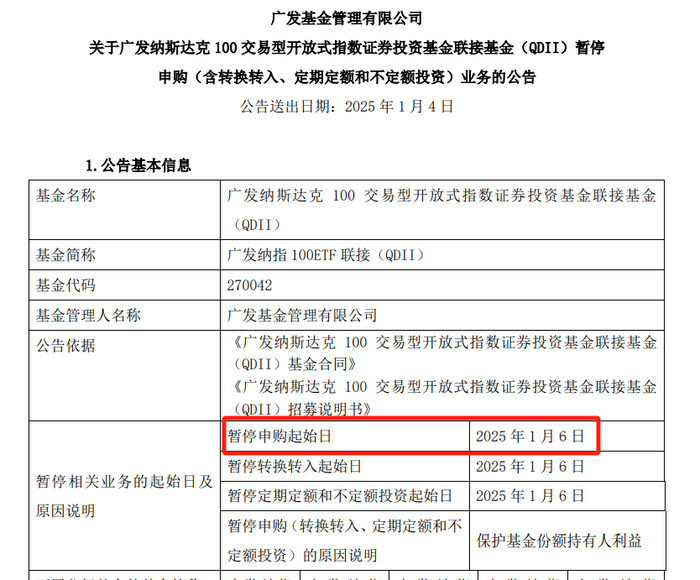 本公司决定自 2025 年 1 月 6 日起,广发纳斯达克 100 交易型开放式指数证券投资基金联接基金(QDII)(以下简称“本基金”)暂停申购(包含转换转入、定期定额及不定额投资)业务, 本基金恢复办理申购(包含转换转入、定期定额及不定额投资)业务的具体时间,届时将另行公告。
