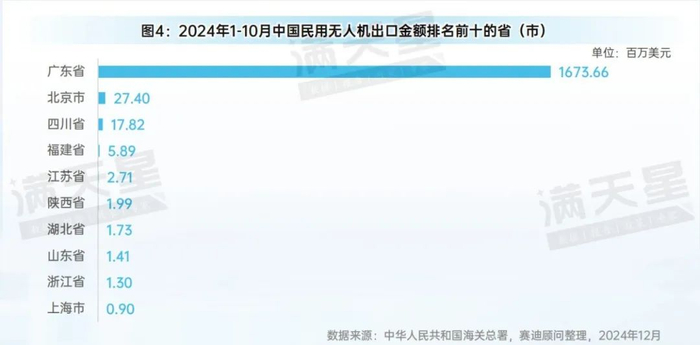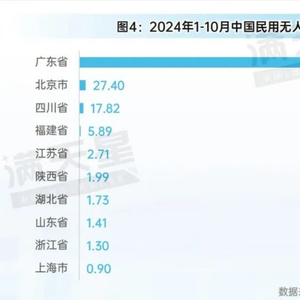 四、2024年1-10月,广东省出口的无人机金额达16.73亿美元,全国排名第一,占中国出口总额的96.4%。第二、三名为北京和四川,出口金额分别为0.27亿美元和0.18亿美元。