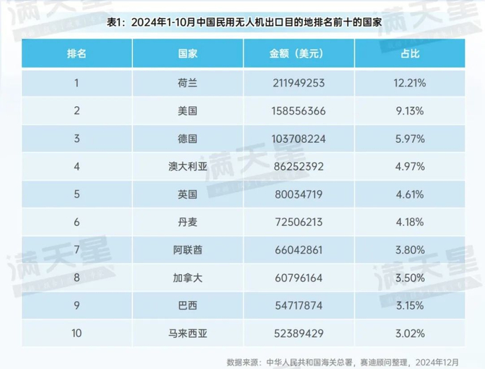 五、2024年1~10月,向荷兰出口民用无人机金额最多,约2.12亿美元,占中国出口总额的12.21%。其次是美国和德国出口额分别达到1.59亿美元和1.03亿美元,占比分别达到9.13%各5.97%。