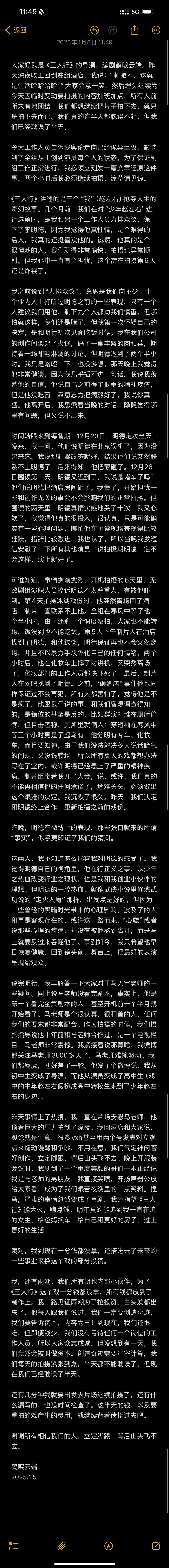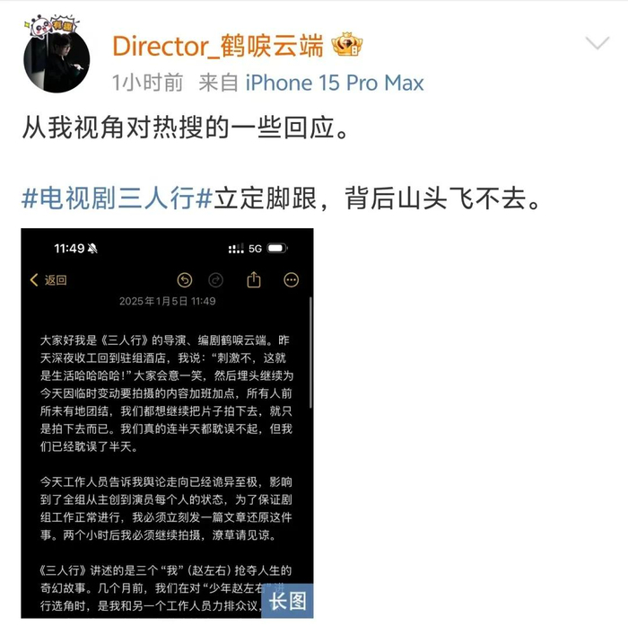 1月5日中午,《三人行》导演发长文回应李明德、马天宇争议。