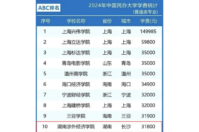 比如,湖南涉外经济学院,在2024年中国民办大学学费排名榜单上,挤进前十,学费为3.18万元/年。