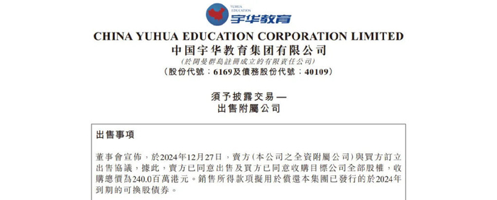 交易价格为2.4亿港元,宇华教育称,出售事项可扩大现金流量,用于偿还债务。