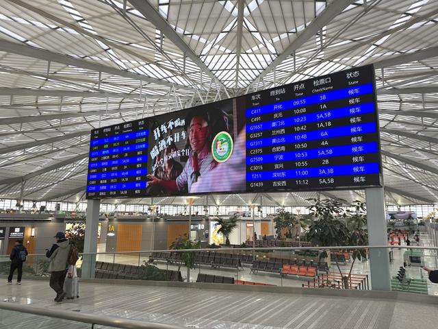 与以往坐“绿皮车”流程一样,进站后映入眼帘的便是上海南站标志性的玻璃圆顶和通往一层候车大厅的宽敞斜坡。记者注意到,“1A”“1B”等每个检票口的标识都很醒目,在二层进站层也能注意到这些黄色字体的标识,很利于赶时间的旅客及时锁定自己要去的检票口。