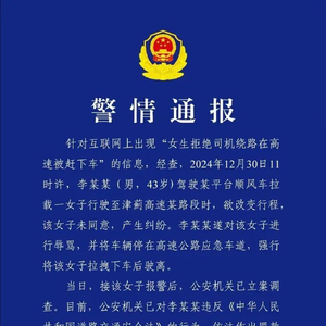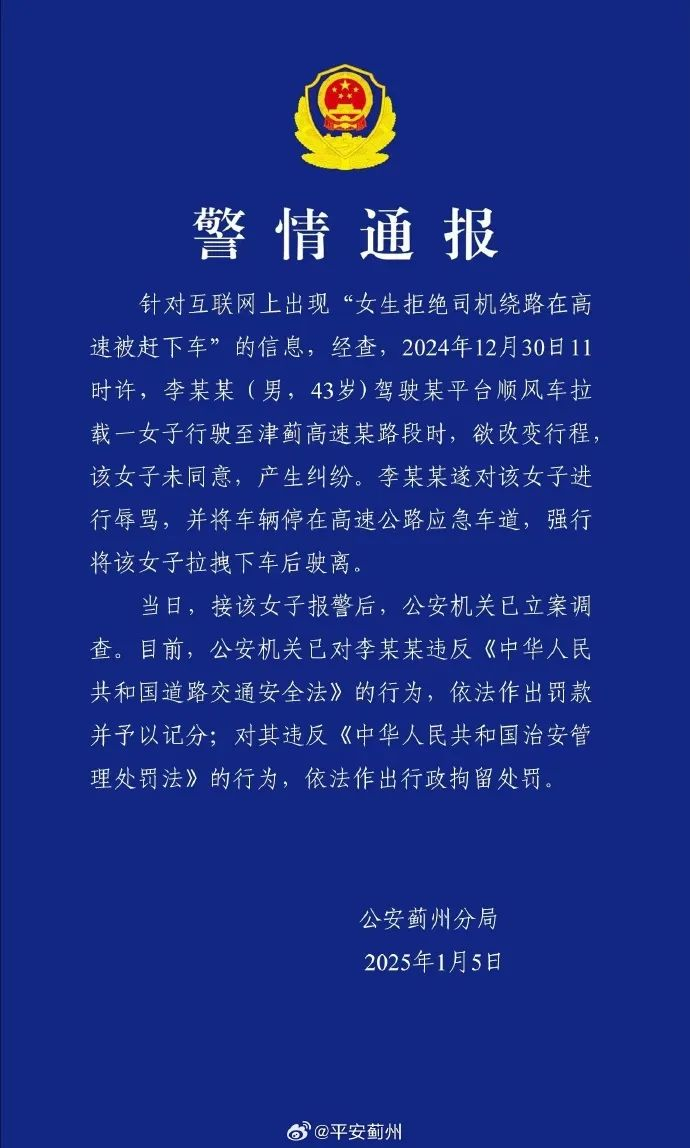 针对互联网上出现“女生拒绝司机绕路在高速被赶下车”的信息,经查,2024年12月30日11时许,李某某(男,43岁)驾驶某平台顺风车拉载一女子行驶至津蓟高速某路段时,欲改变行程,该女子未同意,产生纠纷。李某某遂对该女子进行辱骂,并将车辆停在高速公路应急车道,强行将该女子拉拽下车后驶离。