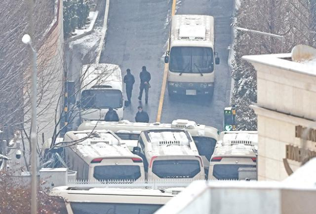 5日,位于首尔龙山区汉南洞的韩国总统官邸入口被多辆公交车封堵。此时针对总统尹锡悦的逮捕令有效期仅剩一天。(视觉中国)