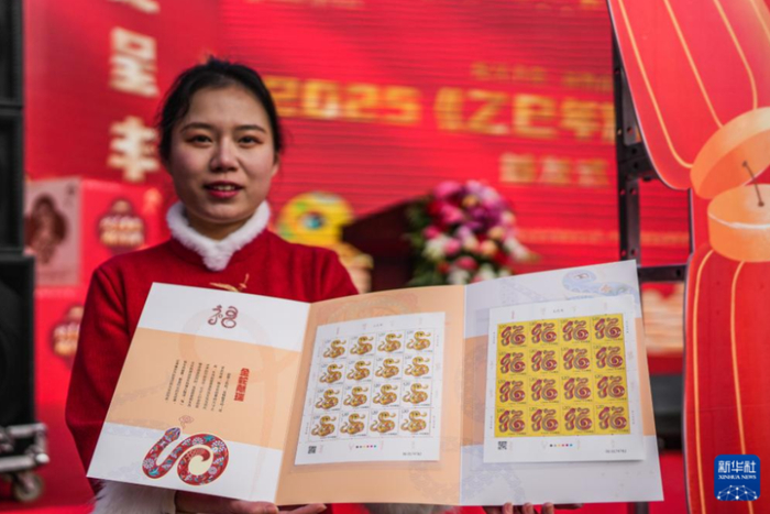 4、《乙巳年》特种邮票发行中国邮政1月5日发行《乙巳年》特种邮票。《乙巳年》特种邮票以敦煌壁画和传统民俗为灵感来源,将蛇的形象与吉祥寓意巧妙结合。邮票一套两枚,图案名称分别为“蛇呈丰稔”“福纳百祥”。(新华社)