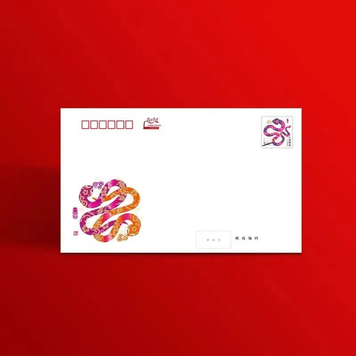 信封邮资整体采用火红的设计,营造出新年红红火火的氛围,整体以蛇的设计为主题,祥瑞气氛十足。