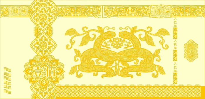 珍藏册内还含有1枚2025乙巳蛇年纪念金箔钞,蛇的形象灵动优美,金光闪闪,设计感十足。