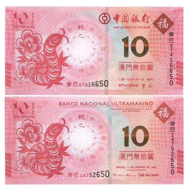 该枚生肖蛇年纪念钞为澳门生肖钞系列的第二枚,也是2013年蛇年的第一枚新钞。面额10元,纪念钞图案为每年的生肖图案。2013年1月,澳门两家发钞银行将为蛇年发行第二款农历新年10元纸币,以庆祝中国新年。