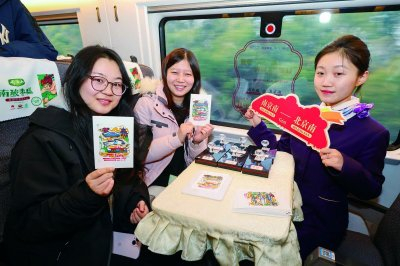 G66次列车乘务人员通过发放宣传手册和南京文旅地图、打卡集章等形式与旅客互动,让旅客充分感受“紫金号”品牌文化内涵。 南京日报/紫金山新闻记者 徐琦 摄