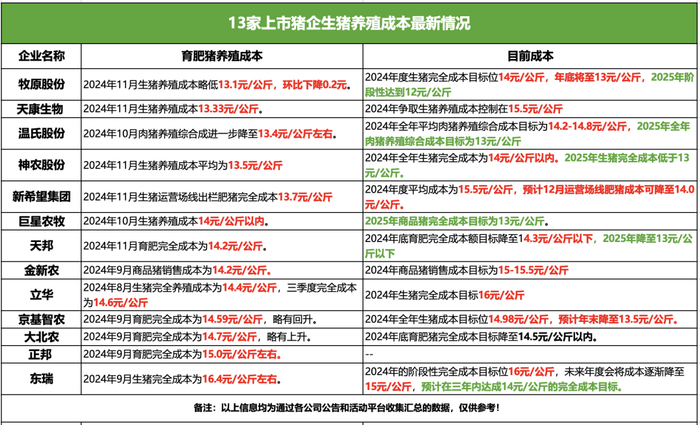 牧原、温氏、新希望等13家上市猪企最新生猪成本情况
