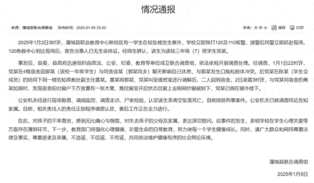 据蒲城县人民政府网站消息,2025年1月2日3时许,蒲城县职业教育中心新校区有一学生在校坠楼发生意外,学校立即拨打120及110报警,接警后民警立即赶赴现场,120急救中心到达现场后,宣告当事人已无生命体征。经师生辨认,该生为该校三年级(7)班学生党某。